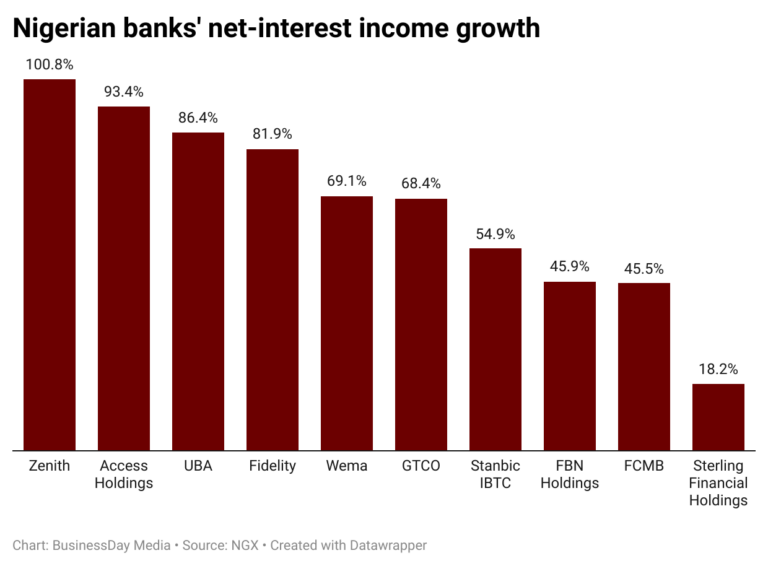 Zenith Bank recorded the highest net-interest income growth of 100.8 percent followed by Access Holdings with 93.4 percent, UBA (86.4 percent), Fidelity Bank (81.9 percent), and Wema Bank (69.1 percent).
