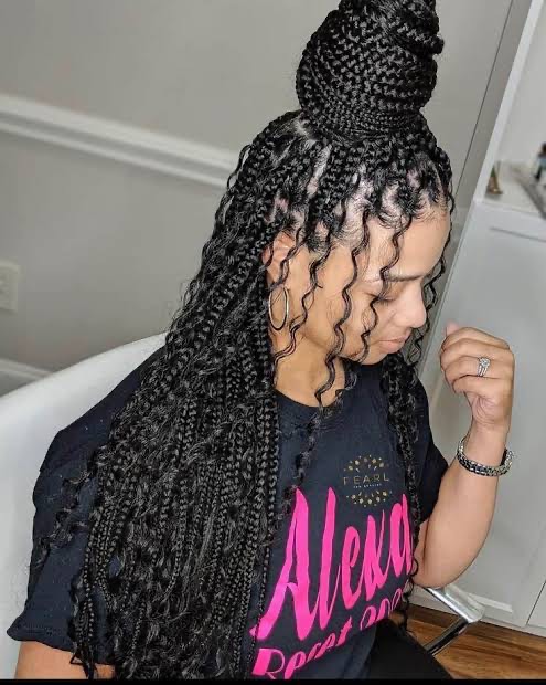 You may create boho braids or bohemian box braids by adding curly hair to your box braids. The wavy hair can have knots or be knotless. This method makes this braided look beautiful.