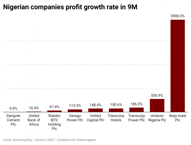UBA reported the highest profit of N525.3 billion, followed by Dangote Cement with N279.1 billion from N277.5 billion, Stanbic IBTC Holding with N182.8 billion from N109.2 billion, Transcorp Power with N58.4 billion, Geregu Power with N24.1 billion, United Capital with N15.9 billion, Unilever with N11 billion, Transcorp hotels with N10.2 billion, Ikeja Hotel N2 million and Champion Brewery with N21 million from a loss of N77 million.