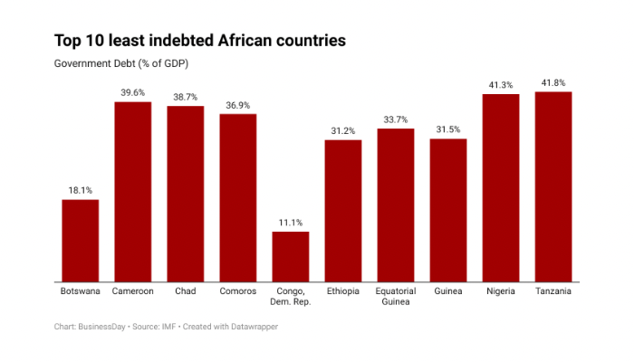 Tanzania takes the lead among Africa’s least indebted nations with a debt-to-GDP ratio of 41.8%. The East African nation’s relatively low ratio indicates a balanced monetary approach, contributing to economic stability and resilience.