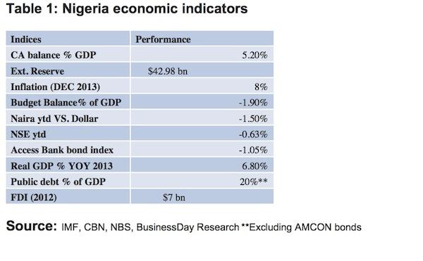 Foreign Investors currently hold $11.6 billion of Nigerian bonds and Treasury bills equivalent to about 25 percent of Nigeria’s outstanding debt stock. Offshore investors have however begun to slow their rate of purchases of Nigerian sovereign debt in 2014 as the U.S. Fed began reducing its $85 billion in monthly bond purchases.