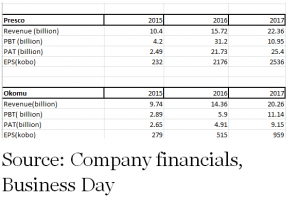 A similar scenario played out with Okomu oil Plc and Presco Plc, both of which benefitted from the CBN’s dollar restriction on palm oil imports. Presco’s revenues rose 115 percent between 2015 and 2017, while profit climbed a staggering 920 percent within the same period.