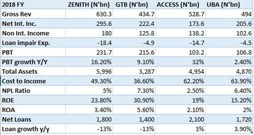 The four banks (Zenith, GTB, Access and UBA), had combined total assets of N19.1 trillion or $53 billion as at year end 2018.