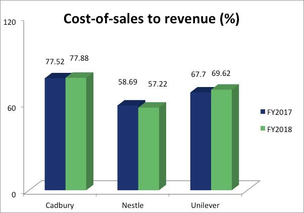 Year-on-year comparison showed that Unilever recorded the biggest decline in the share of production cost in revenue from 67.7 percent to 69.62 percent in 2018, that of Cadbury declined by 0.36 percent points from 77.88 percent in 2017, while Nestle posted 1.47 percent.