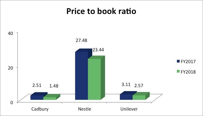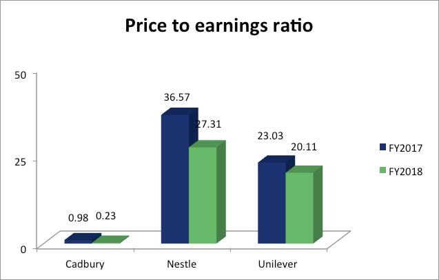 Among the three fast moving consumer goods, price to earnings ratio was lowest for Cadbury at 0.23x compared to Nestle (27.31x) and Unilever (20.11x) in 2018, indicating that Cadbury is the cheapest among peers.