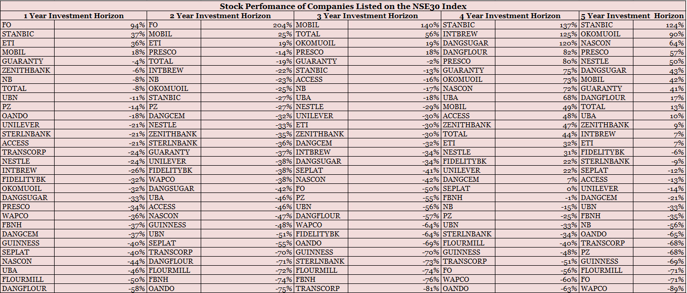 Taking our sample from the NSE30 index which comprises of 30 most capitalised companies listed on the exchange, running through these stock performances over a period of five years.