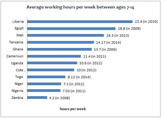 Child labour is concentrated primarily in agriculture (71 per cent), which includes fishing, forestry, livestock, herding and aquaculture; for both subsistence and commercial farming; 17 per cent in services; and 12 per cent in the Industrial sector, including mining.The chart below shows the weekly average of hours worked by children (ages 7-14) who are economically active in some African countries.