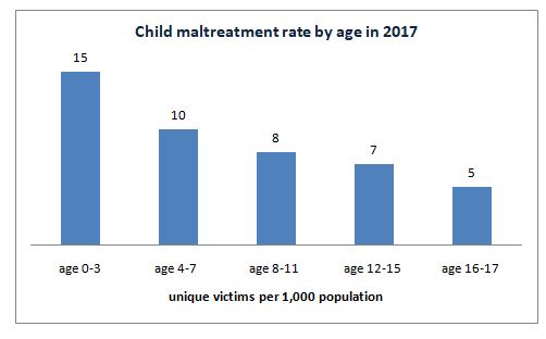 Young children experience higher rates of maltreatment than older children, the analysis of available records has shown. In 2017, children 3 years and younger had a maltreatment rate of 15 per 1000, compared with 10 per 1000 for children ages 4 to 7, as well as 8 per 1000 for ages children aged 8 to 11; while it was 7 per 1000 for children aged 12 to 15, and 5 per 1000 for children aged 16 to 17 years.
