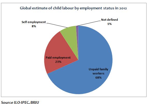 Hazardous child labour is most prevalent among the 15-17 years old. Nevertheless, up to a fourth of all hazardous child labour (19 million) is done by children less than 12 years old. The chart below shows the breakdown of child labour by employment status.