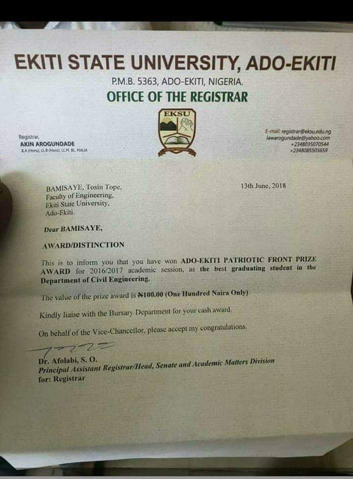 “This is to inform you that you have won ADO-EKITI PATRIOTIC FRONT PRIZE AWARD for 2016/2017 academic session as the best graduating student in the Department of Civil Engineering,” the letter read in part. “The value of the prize award is N100.00 (One Hundred Naira Only).”