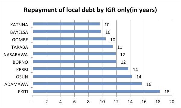 So, if the states of the federation were to repay their domestic debts through internally generated revenue (IGR) only, how long will it take each state to repay all the debts? Using the December 2018 IGR figures, the states with the longest periods of repayments based on this metric are Ekiti, Adamawa, Osun, Kebbi, Borno, Nasarawa, Taraba, Gombe, Bayelsa, Katsina, Bauchi and Cross River. It will take a minimum of ten to eighteen years to offset their domestic debts if the repayment is through IGR only.