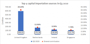 Across continents, capital importation by origin shows that the top 4 sources of capital importation (with inflow exceeding a hundred million dollars each) are the United Kingdom, Netherlands, Ireland, and Singapore. Together these countries account for 69.43 per cent or ($1.01 billion) of total capital importation in Q3 2020.