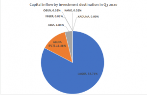 The cultural and economic nerve-centre of Nigeria, Lagos State, emerged as the top destination of capital investment in Nigeria in Q3 2020 with $1.21 billion accounting for 82.71 per cent of the total capital inflow into Nigeria in Q3 2020. The FCT trailed Lagos with a capital inflow worth of $195.57 million (13.38 percent of total capital inflow) and Abia with a $56.07 million inflow within the same period. The remaining 4 states recorded a capital inflow that is less than $600 thousand.