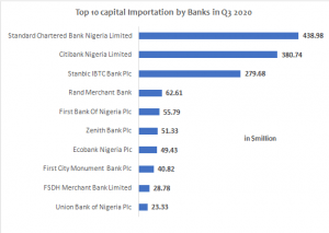 By bank, in the same quarter, only one of the tier-one banks in Nigeria, First Bank of Nigeria (FBN), ranked in the top 5 banks with capital investment in Nigeria. On top of the list is Standard Chartered Bank Nigeria Limited, leading other banks in capital investment in Nigeria inQ3 2020 with $438.98million. This accounted for 30.04 per cent of the total capital inflow in Q3 2020.