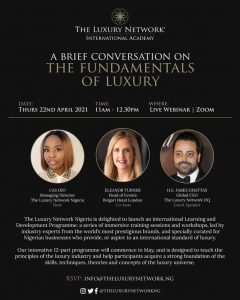 The programme officially commences in May 2021, but on Thursday 22nd April, Managing Director, The Luxury Network Nigeria, Cas Ojo, and Head of Events, Bvlgari Hotel London, Eleanor Turner will host the guest speaker, Global CEO, The Luxury Network, H.E. Fares Ghattas in a live webinar, for ‘A Brief Conversation on the Fundamentals of Luxury’. The upcoming event will provide a launchpad for the 12-part Learning & Development programme.