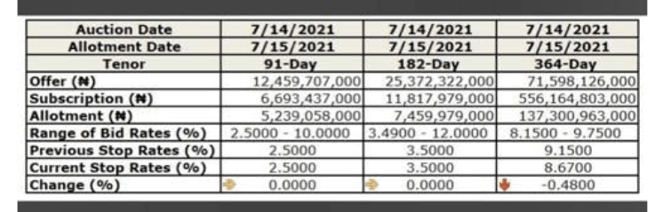 Analysis of the Treasury bills auction results for the week traded July 14, 2021, revealed that the CBN raised N150 billion from the auction. Investors were, however, willing to invest N574.67 billion, more than three times the amount the apex bank raised at the primary market. The CBN had initially sought to issue N109.52 billion but following the high demand and low-interest rate, it allotted N40.48 billion more.