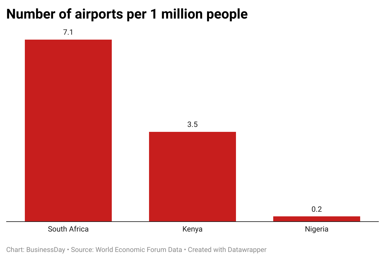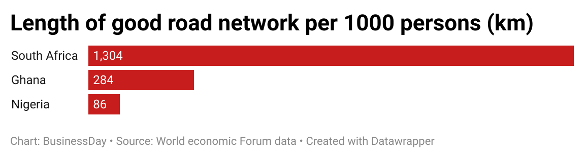 Largely because of failed government policies, private sector funding in infrastructure in Nigeria is lagging peers. In South Africa and Indonesia, the private sector spends $27 billion and $74 billion, respectively, to build infrastructure. According to CIA World Fact book and the World Economic Forum data, the 2020 composite Africa infrastructure index placed Nigeria at 24th, just above Uganda. In South Africa, the length of a good road network per 100, l000 persons is 1,304km while it is a mere 86km in Nigeria, 284km in Ghana. The number of airports per 1 million people in Kenya is 3.5, in South Africa 7.1 and in Nigeria 0.2.