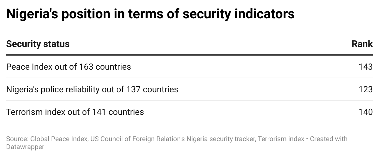 On the security front, Nigeria’s challenges are capable of stretching the wits of the most prepared presidential candidates. The Global Peace Index ranks Nigeria 143 of 163 countries, indicating a critical need for concerted efforts at improving the general security situation in the country. The US Council of Foreign Relation’s Nigeria security tracker ranks Nigeria’s police service reliability at 123 of 137 countries measured, and in terrorism incidence Nigeria is ranked 140 among 141 countries and when it came to organised crimes, Nigeria is ranked 110 among 137 countries.