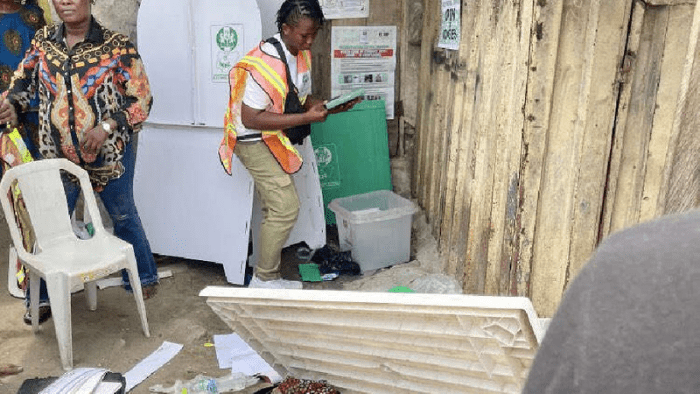 There was a loud screech of car tyres, rapid footsteps, anguished cries, and instant violence. Thugs attack a polling unit at Okunmoyinbo Avenue, Ajah. They upturned plastic boxes, tore up ballot papers, broke chairs and desks, and descended on voters in the queue. Two policemen detailed to provide security were the first to flee.