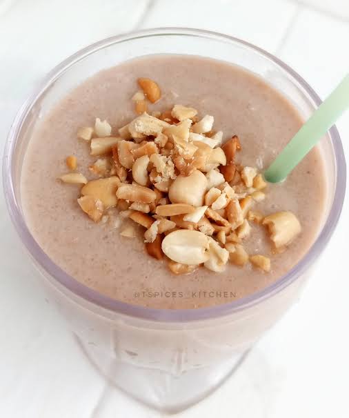 To make this smoothie all you need include 1/2 cup garri, 3 tblspn powdered milk, Groundnuts or cashew nuts, 3 tbspn condensed milk (optional), 1/2 cup coconut milk (optional), banana (optional), milo(optional) and Crushed ice.