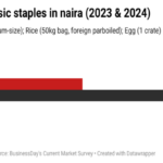 According to Picodi, an international e-commerce platform, the total cost of the ‘survival basket’, which contains 10 litres of milk, 10 loaves of bread, 1.5kg of rice, 20 pieces of eggs, 1kg of cheese, 6kg of meat, 6kg of fruits and 8kg of vegetables, rose by 33.1 percent to N64,060 in January 2024 from N48,130 in the same period of last year.