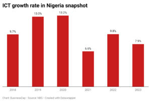 In 2023, Nigeria’s Information and Communication Technology (ICT) growth rate declined to 7.9 percent from the 9.7 percent reported in 2022, according to Gross Domestic Product (GDP) data.