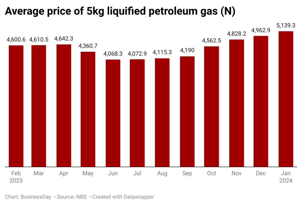 In January, the average retail price for refilling a 5kg Cylinder of Liquefied Petroleum Gas (cooking gas) increased by 3.55 percent on a month-on-month basis from N4,962 recorded in December 2023 to N5,139 in January 2024.