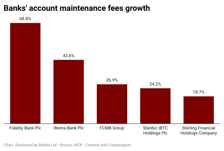 In the banks’ latest financial statement, Fidelity Bank recorded a 68.8 percent increase in account maintenance fees, followed by Wema Bank with 43.6 percent and FCMB Group with 26.9 percent.