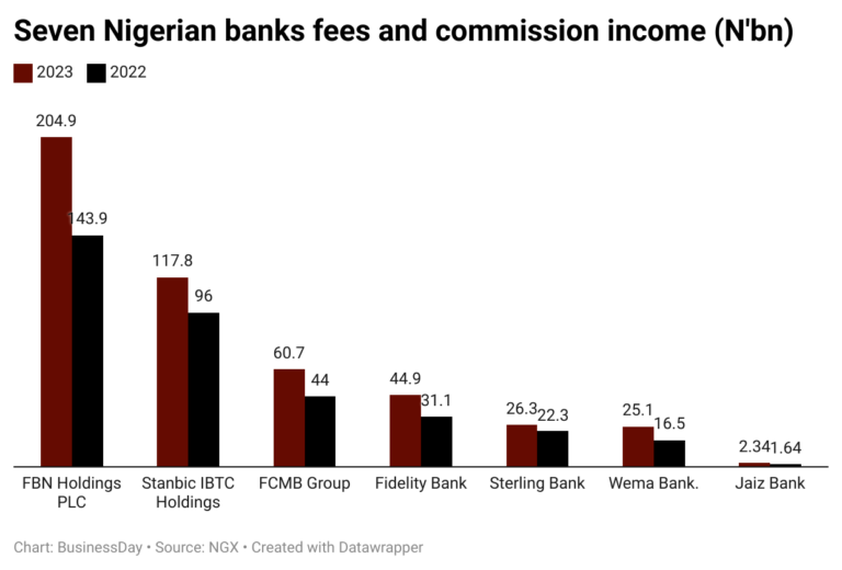 Generally, the banks recorded a 35.6 percent increase in fees and commission income to N482.04 billion in the year being reported. The banks include First Bank Holdings (FBNH), Fidelity Bank, FCMB Group, Stanbic IBTC Holdings, Sterling Bank, Wema Bank, and Jaiz Bank.