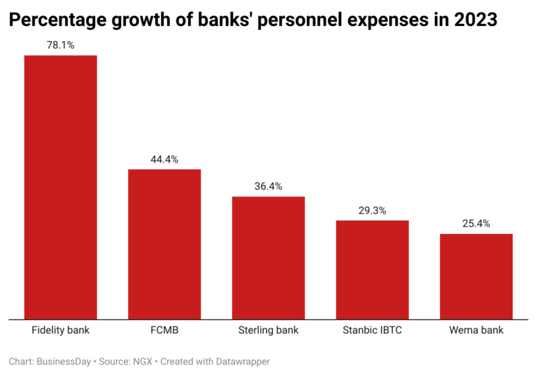 The combined personal expenses of Fidelity Bank, FCMB Group, Sterling Financial Holding Company, Stanbic IBTC and Wema Bank rose to N219.9 billion last year from N154.4 billion in 2022.