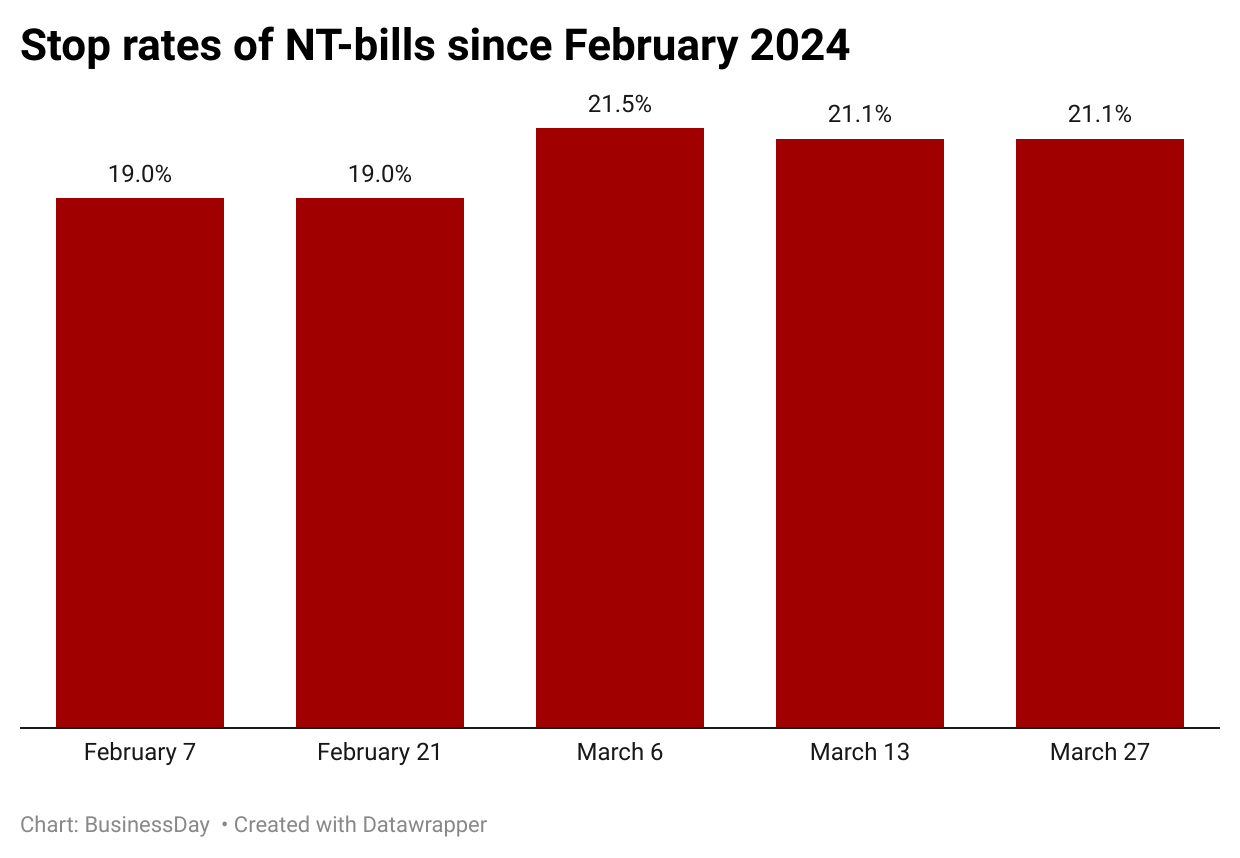 At the last auction, the demand for the 364-day bills jumped to a record N2.48 trillion in a single auction, 17 times more than the N142 billion that was offered by the government, according to data from the Debt Management Office (DMO).