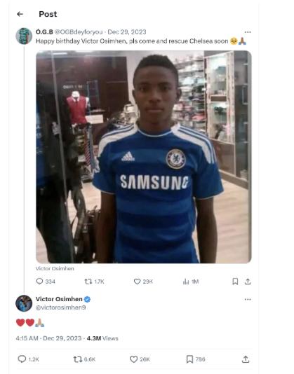 The fans were hit with another jolt of excitement when Osimhem reacted to an X post from a user asking the striker to join Chelsea.