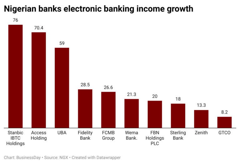 UBA recorded the highest electronic banking revenue of N125.5 billion, followed by Access Holdings with N101.6 billion. FBN Holdings, Zenith Bank, and GTCO had N66 billion, N51.8 billion and N40.8 billion respectively.