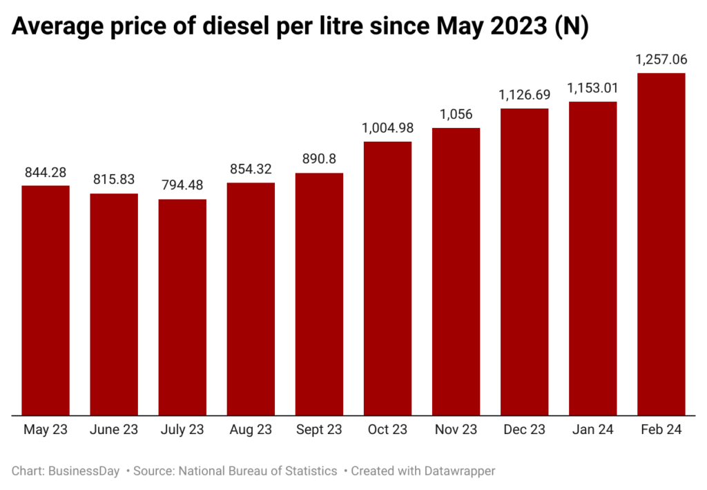 The average retail price of diesel paid by consumers increased by 50.20 percent on a year-on-year basis from N836.91 per litre in February 2023 to N1,257.06 per litre in February 2024.