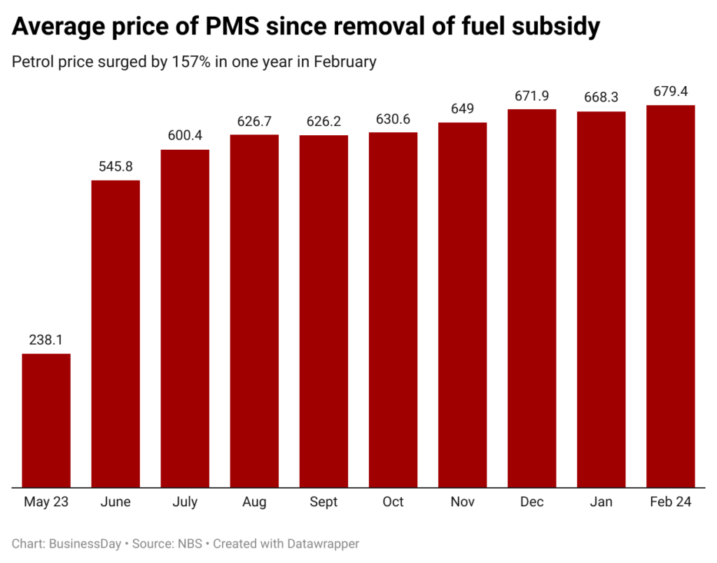 With the removal of the petrol subsidy in May 2023 by President Bola Tinubu, the petrol prices have tripled from about N238 to N679, causing public transportation providers to hike fares and pushing inflation up to a 27-year high of 31.7 percent in February.
