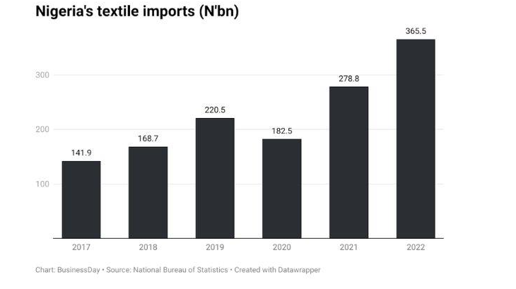 Data from the National Bureau of Statistics indicate a significant increase in textile imports in 2022, rising by 100.30 per cent to N365.5 billion ($862.23 million at the 2022 exchange rate). This represents the highest level in at least 15 years, up from N182.5 billion ($462.12 million at the 2020 exchange rate) in 2020.