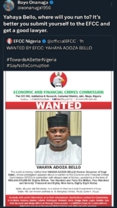Reacting to a post declaring Bello wanted on the EFCC’s X account, Onanuga said it is better for the former Kogi governor to submit himself and get a good lawyer.