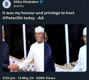 “It was my honour and privilege to host @PeterObi today. -AA,” a caption of photos the former vice president posted reads.