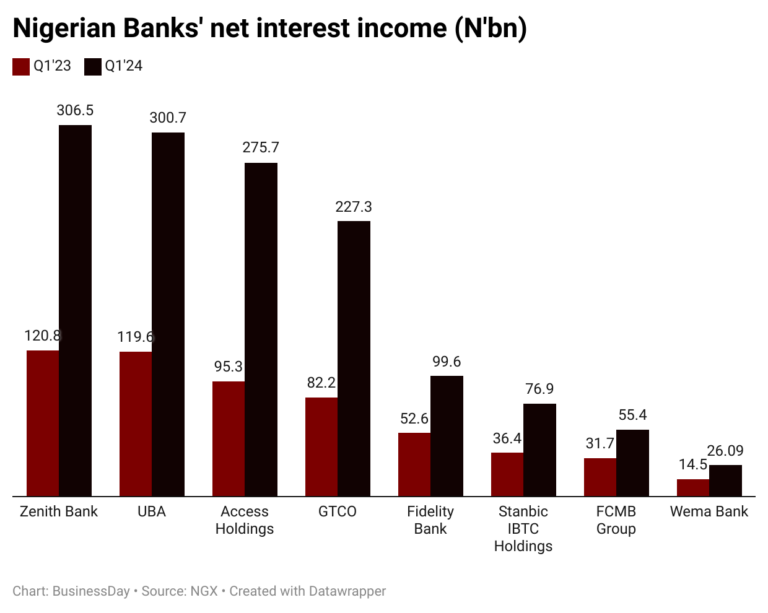 According to their latest financial statements, the net interest income of Access Holdings rose to 189.30 percent to N275.7 billion in Q1 from N95.3 billion in the same period of last year; GTCO, 176.5 percent to N227.3 billion; and Zenith Bank, 153.7 percent to N306.5 billion.