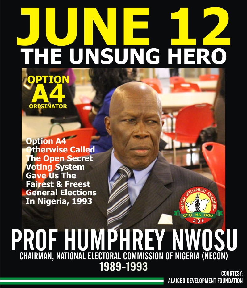 As Nigerians celebrated June 12, the Alaigbo Development Foundation put up a banner reminding citizens about “The Unsung Hero of June 12” and the “Option A4 originator”, Prof Humphrey Nwosu.