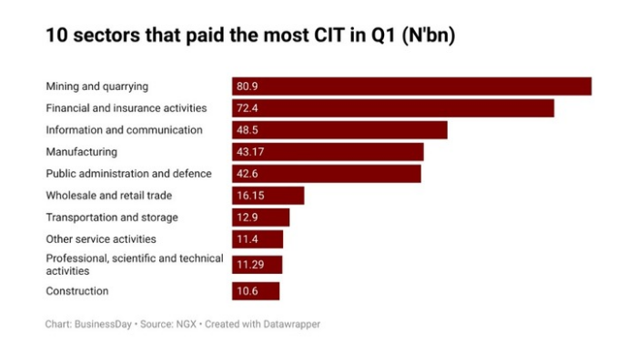 The report disclosed that in Q1, the Mining and quarrying sector paid the highest tax of N80 billion, followed by financial and insurance activities with N72.4 billion and Information and communication with N48.5 billion.