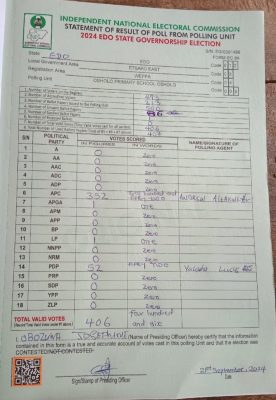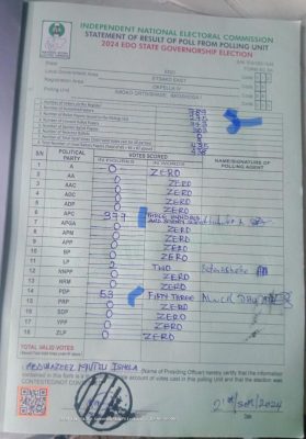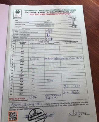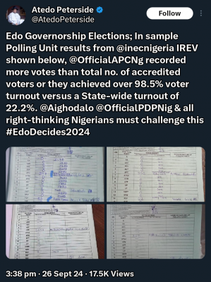Reacting to the development, Peterside said, “Edo Governorship Elections; In sample Polling Unit results from @inecnigeria IREV shown below, @OfficialAPCNg recorded more votes than total no. of accredited voters or they achieved over 98.5% voter turnout versus a State-wide turnout of 22.2%. @Aighodalo @OfficialPDPNig & all right-thinking Nigerians must challenge this #EdoDecides2024.”