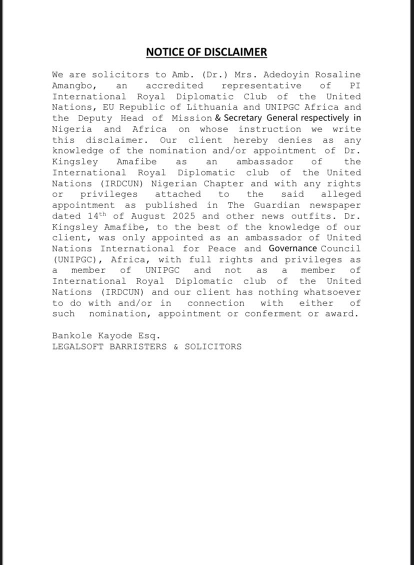 Our client hereby denies any knowledge of the nomination and/or appointment of Dr. Kingsley Amafibe as an ambassador of the International Royal Diplomatic Club of the United Nations (IRDCUN) Nigerian Chapter and with any rights or privileges attached to the said alleged appointment as published in The Guardian newspaper dated 14th of August 2025 and other news outlets.