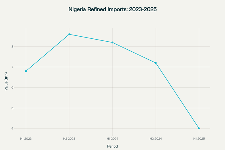 Chart 3: Half-yearly value of Nigeria’s refined product imports, 2023–2025 (₦ trillion)