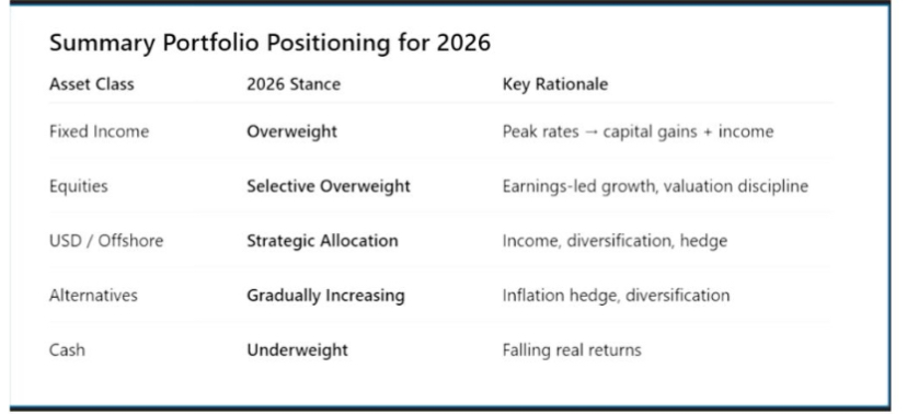The investment environment in 2026 calls for selectivity, forward-looking positioning, and active diversification. As markets transition from peak tightening to normalization, opportunities will increasingly favour investors who anticipate, rather than react to, policy and market inflection points. Our views are as follows: