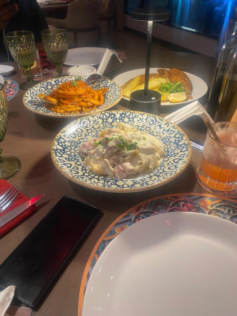 Chuks, our waiter, has his name embroidered on his apron. He moves with the practised efficiency of someone trained not just to serve but to understand what he’s serving. “The calamari,” he explains, setting down the Calamari Alla Romana, “is fried Roman-style.” The rings arrive golden, tender, accompanied by tartar sauce that hasn’t been sitting in a squeeze bottle. This is part of what Bernard Zaatar, Farfallino’s manager, means when he describes their training philosophy: servers here learn to help guests understand the menu, then give them space to enjoy the experience.