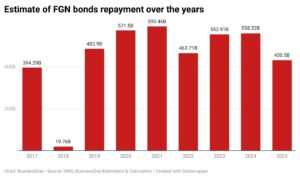 Analysis conducted by BusinessDay using data from the Debt Management Office (DMO) indicates that N1.03 trillion in 2026 will be the highest payout in bond maturities. In 2024 and 2025, FGN repaid about N558 billion and N430 billion, respectively, which shows a growing trend in public debt.
