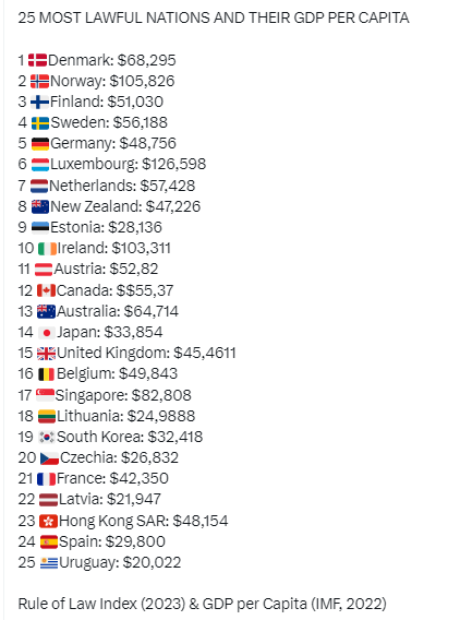 According to Statisense, here are the 25 most lawful nations and their GDP per capita
