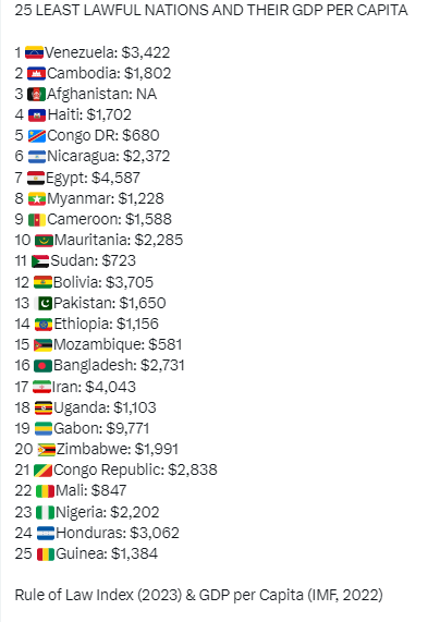 According to Statisense, here are the 25 least lawful nations and their GDP per capita