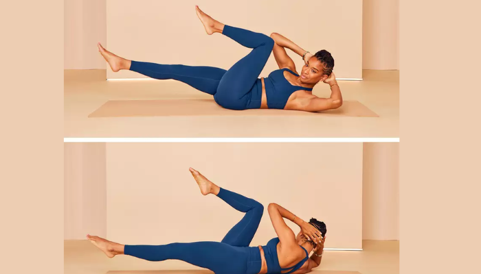 - Switch sides, bringing your left elbow toward your right knee in a pedalling motion.